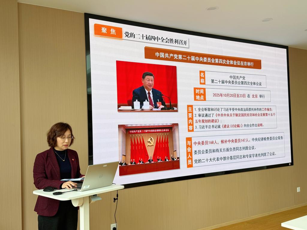 李旸以《深入学习贯彻党的二十届四中全会精神,向着全面推进中国式现代化阔步前行》为题讲授党课,为中心组和支部党员进行理论辅导。她强调了党的二十届四中全会的重大意义和“十四五”时期我国发展取得的重大成就,深入阐述了“十五五”时期的重要地位、指导思想、重大原则以及主要目标,要求大家学习好贯彻好全会精神。她对学院工作提出指导性意见:科学制定十五五规划,聚焦国家战略,明确发展定位,结合学院实际,主动融入学校的发展战略;集中做好学生就业工作,关注重点群体,加大帮扶力度;推进基层党建规范化、法制化、科学化建设,构建一融双高新生态。