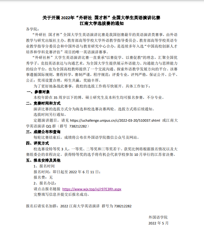 关于开展2022年“外研社 国才杯”全国大学生英语演讲比赛江南大学选拔赛的通知
