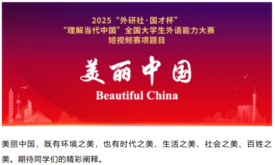 为深入贯彻党的二十大精神,落实立德树人根本任务,推动“三进”工作纵深发展,为国家培养更多有家国情怀、有全球视野、有专业本领的高水平国际化人才,为加强我国国际传播能力建设、推动构建人类命运共同体提供人才支撑,在上级主管部门指导和支持下,2025“外研社·国才杯”“理解当代中国”全国大学生外语能力大赛将于2025年5月至12月举办。短视频赛项为大赛下设分项。为了更好地备战此赛事,我校的选拔工作将尽快展开。具体工作如下: