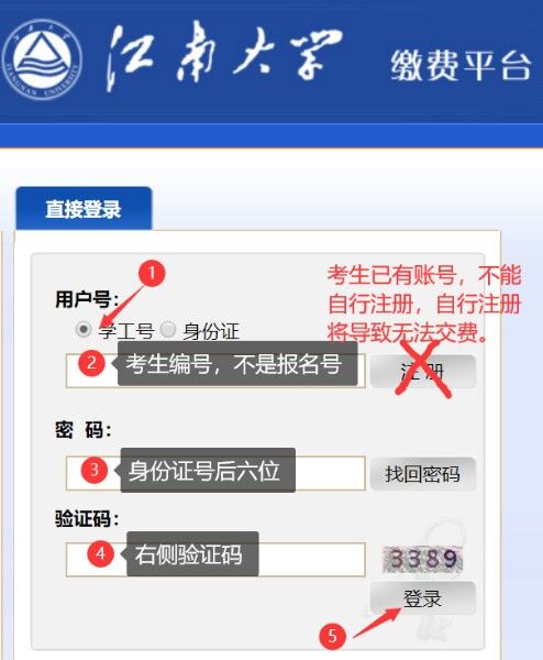 缴费说明:进入复试考生在学院规定的时间内登录“江南大学缴费平台”交纳复试费用,复试收费标准:80元/生。缴费网址://pay.timicasino.com/payment/。登录账号为准考证上的考生编号,登录密码为身份证后六位(友情提醒:考生账号已开通,切勿自行注册)。按照提示交费(使用网银),并打印或截图保存付费凭证。