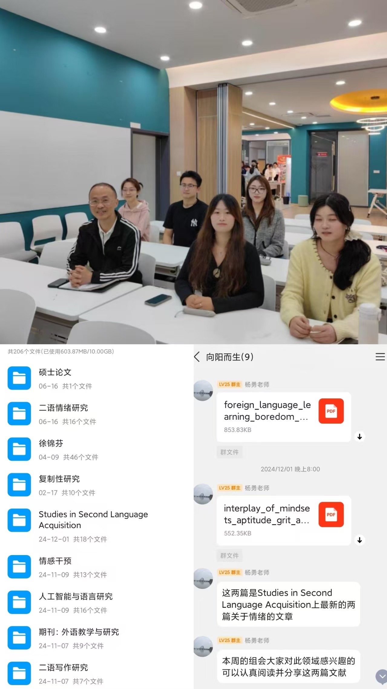 “教育不是灌输,而是点燃火焰”,杨老师的办公室永远向学生敞开。在学术研究中,杨老师鼓励学生勇于探索,寻找自己的研究兴趣,在感兴趣的领域努力耕耘,点燃学术激情,破译语言密码。在组会上,他认真倾听学生的学术报告,为每一个学生答疑解惑。平日里,每每遇到好的文章,杨老师都会与团队成员分享,构建每一个热点主题的文献库,方便学生进行阅览和深入学习。他常说:做学问要有三口气:灵气、静气和霸气,选题要顶天立地,结论要意料之外,情理之中;他常说:为人要低调,为学可高调,对自己的研究,要有底气,甚至霸气。