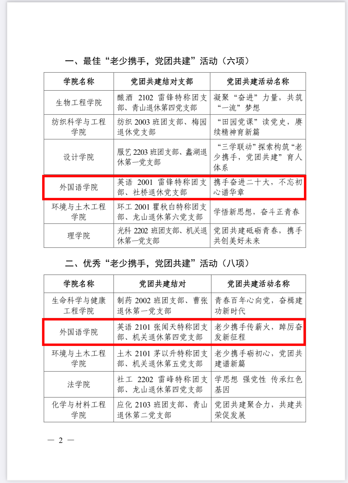 报送的两项活动均获表彰。社桥退休党支部与英语2001团支部组织申报的活动荣获“最佳党团共建活动”(全校共六项),机关退休第四党支部与英语2101团支部组织申报的活动荣获“优秀党团共建活动”(全校共八项)。